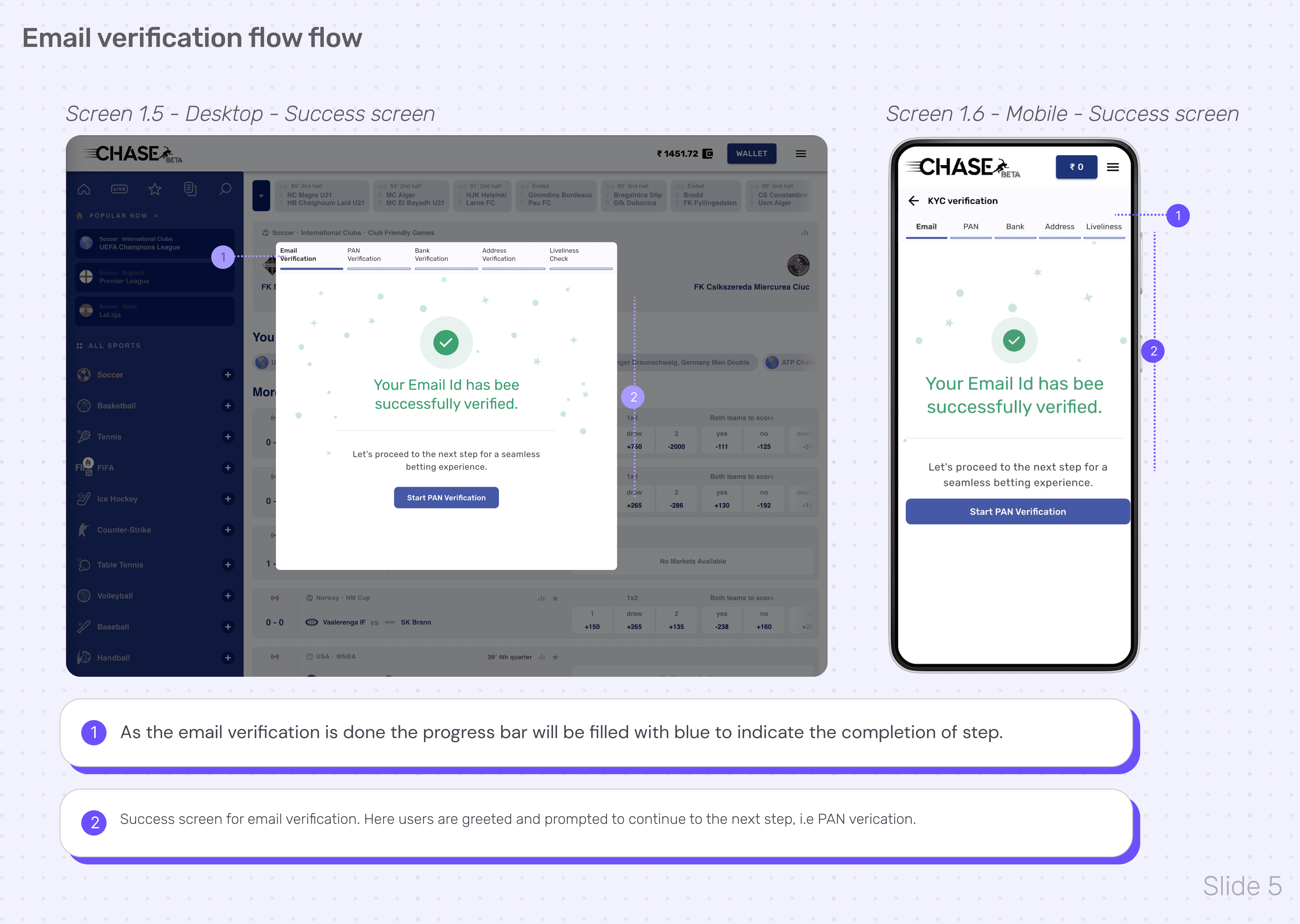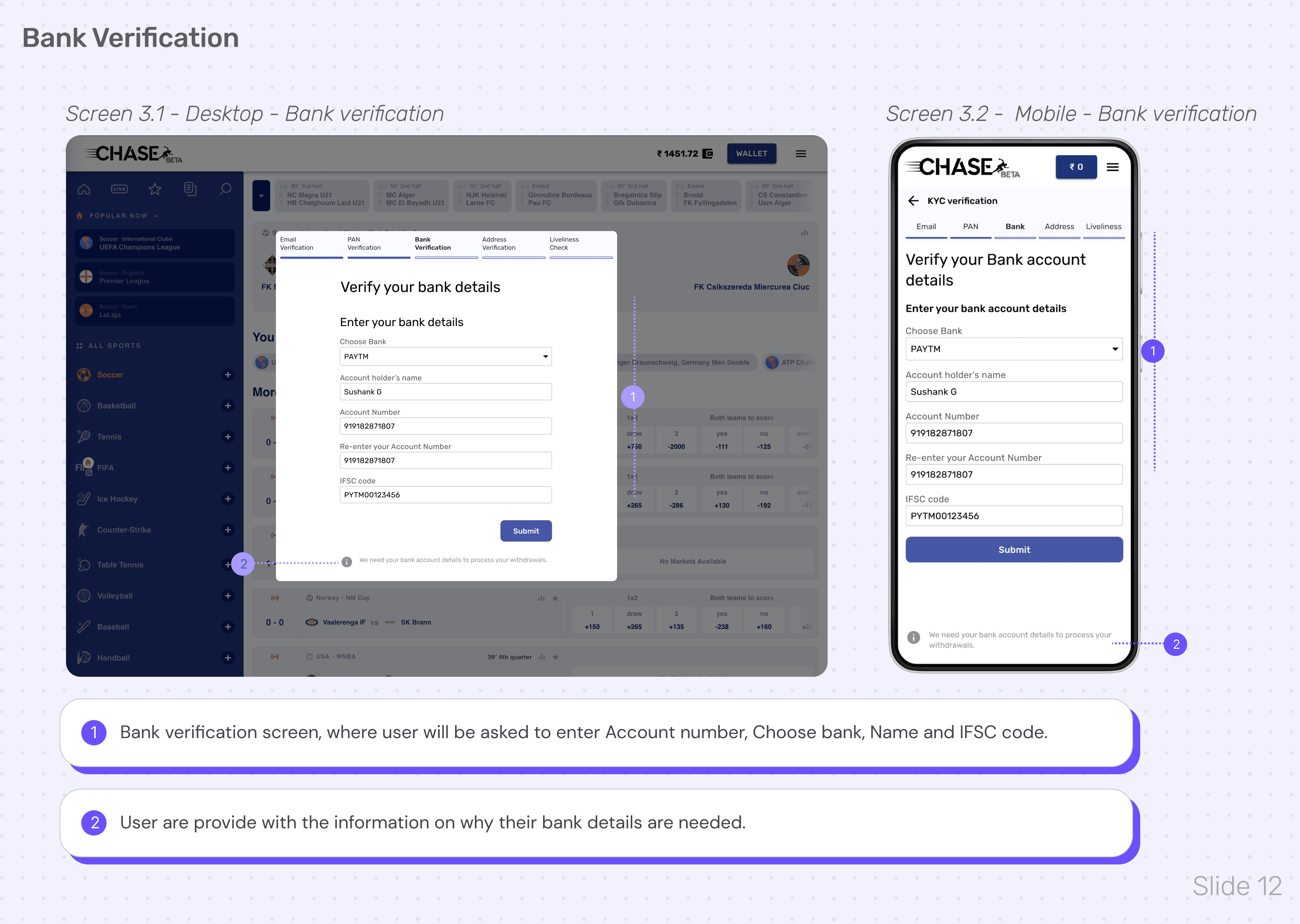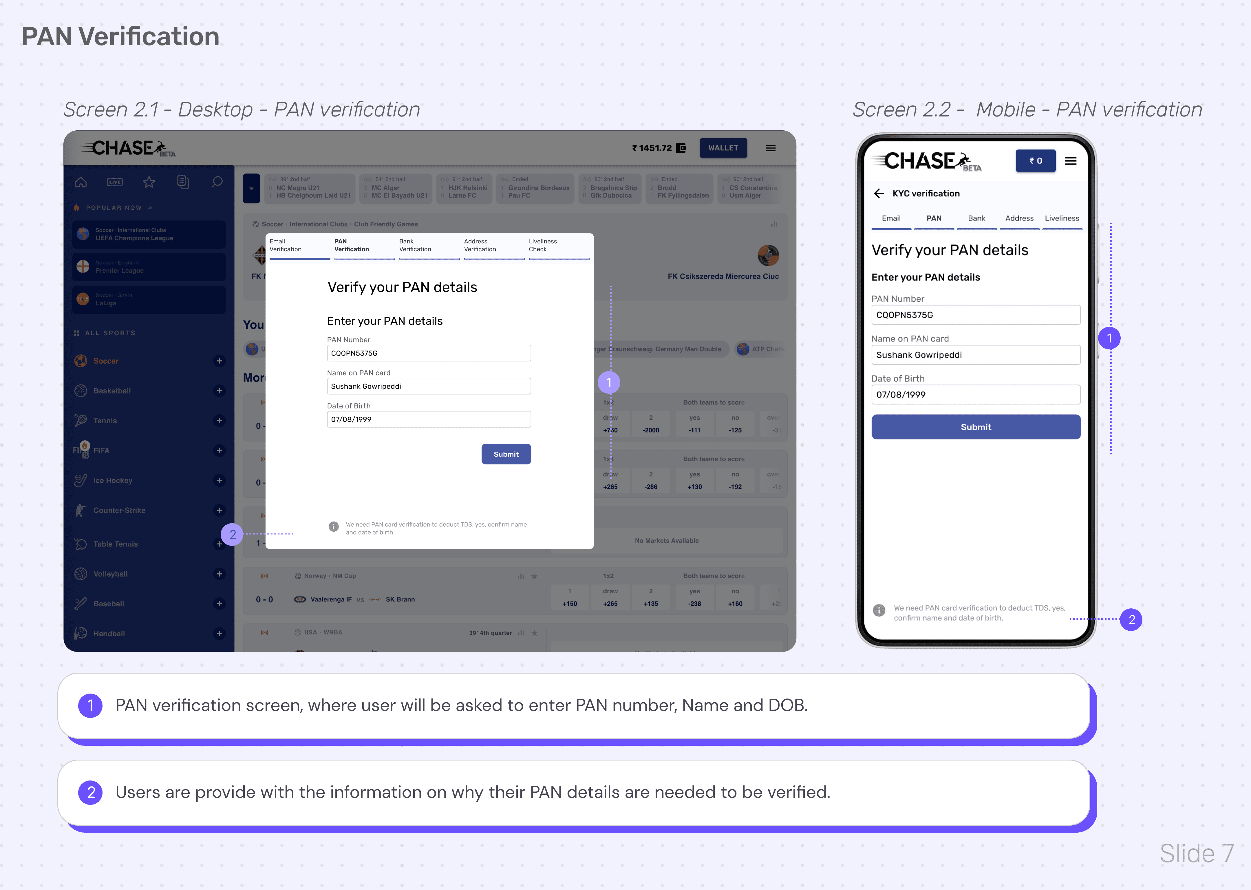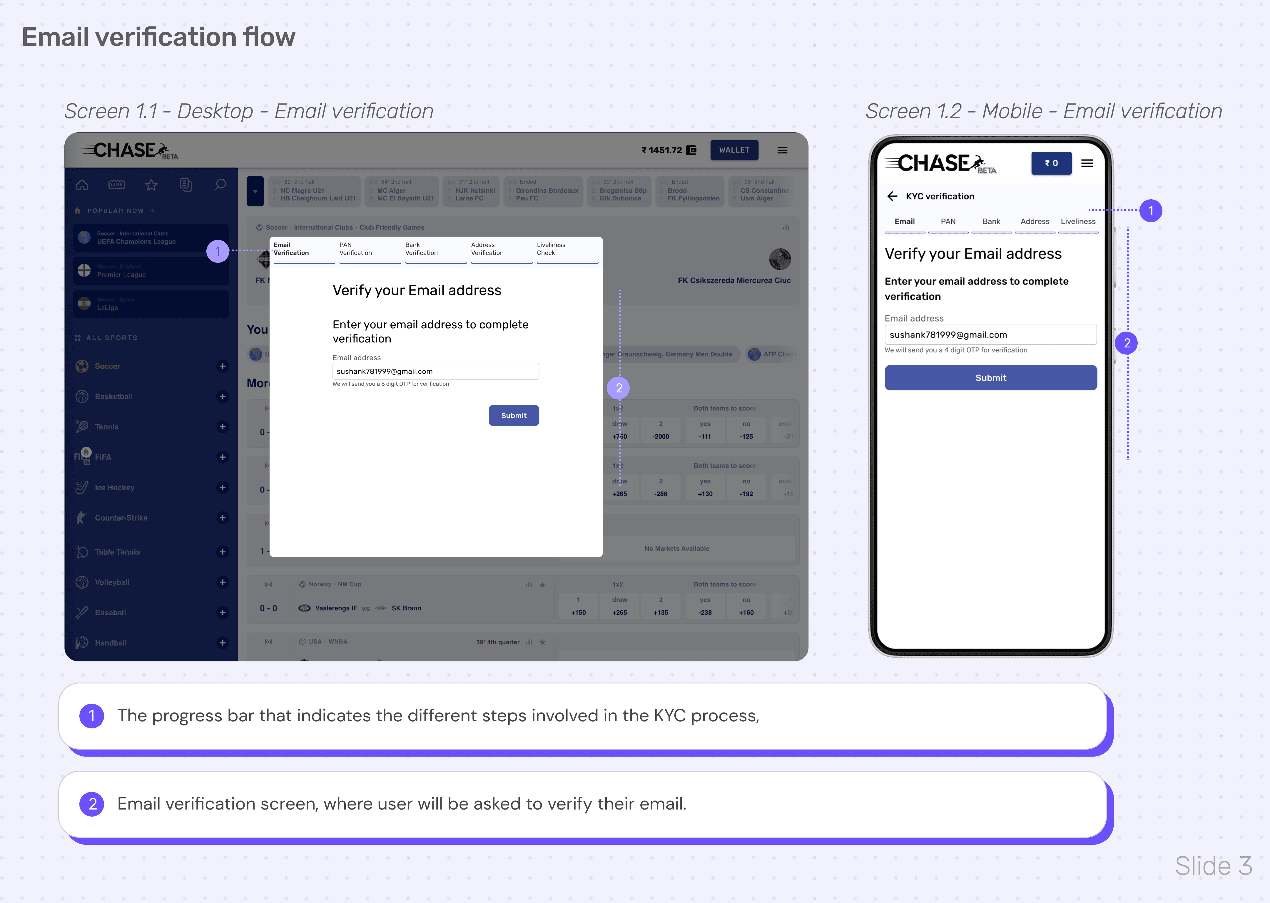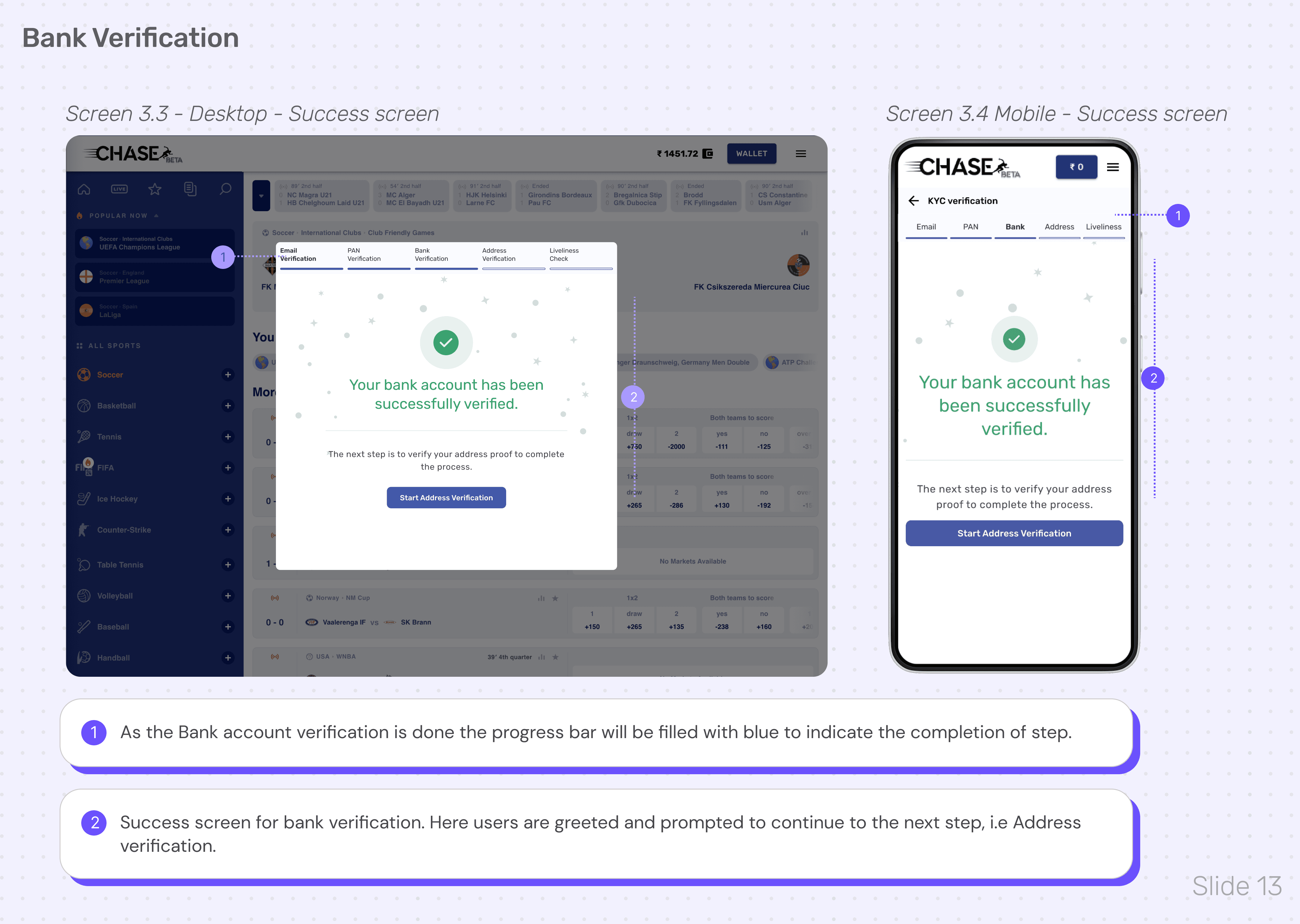 Embarking on a journey toward comprehensive user verification in the realm of digital betting and deposits, I had the privilege of designing the complete KYC flow. Comprising five critical steps – email verification, PAN verification, bank account verification, address proof verification, and a liveliness check – this project ensures users can seamlessly begin depositing, placing bets, and withdrawing their winnings. The goal was to create a user-friendly and efficient KYC process that safeguards the platform's integrity and user security, making it an essential cornerstone of the user experience.