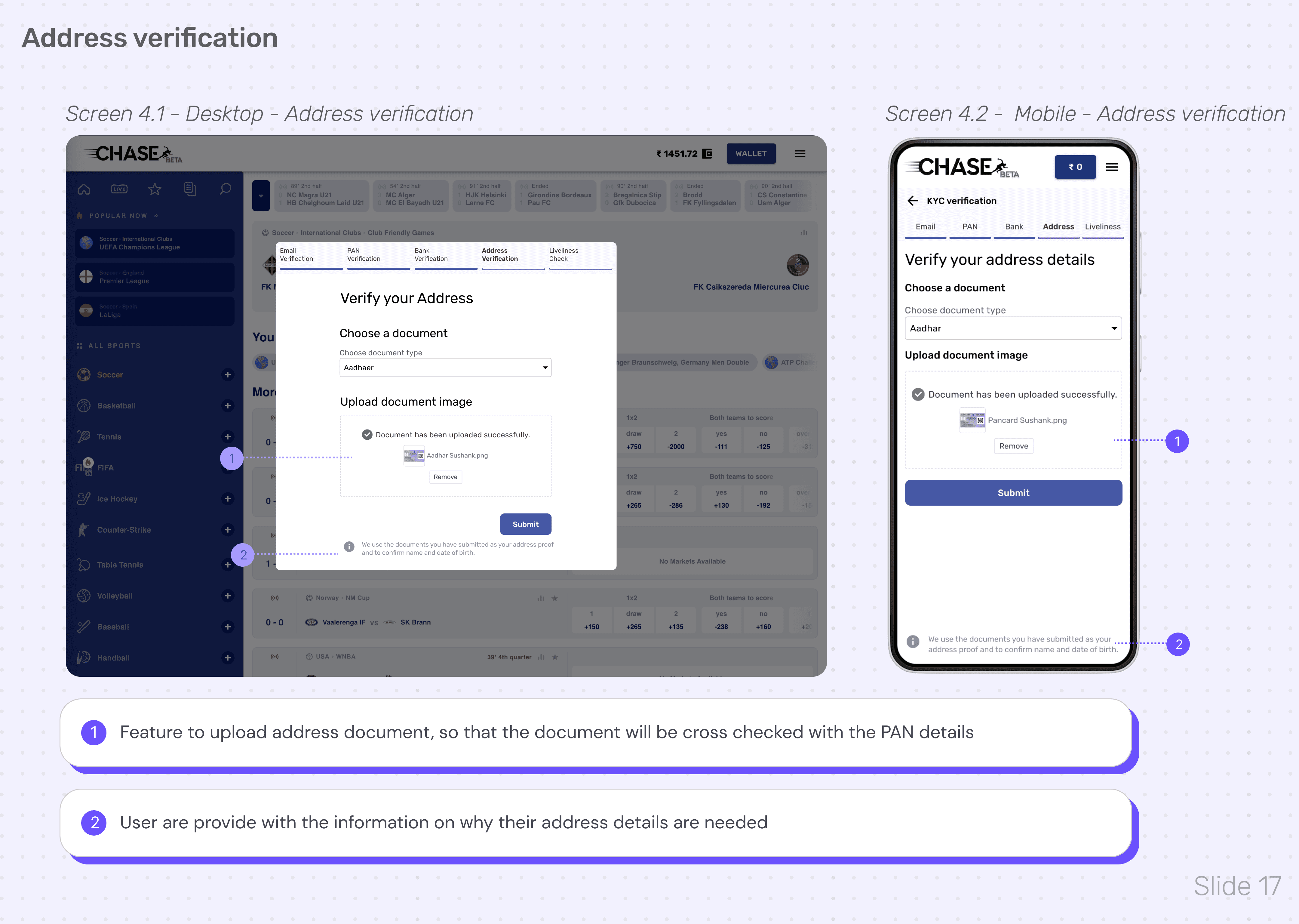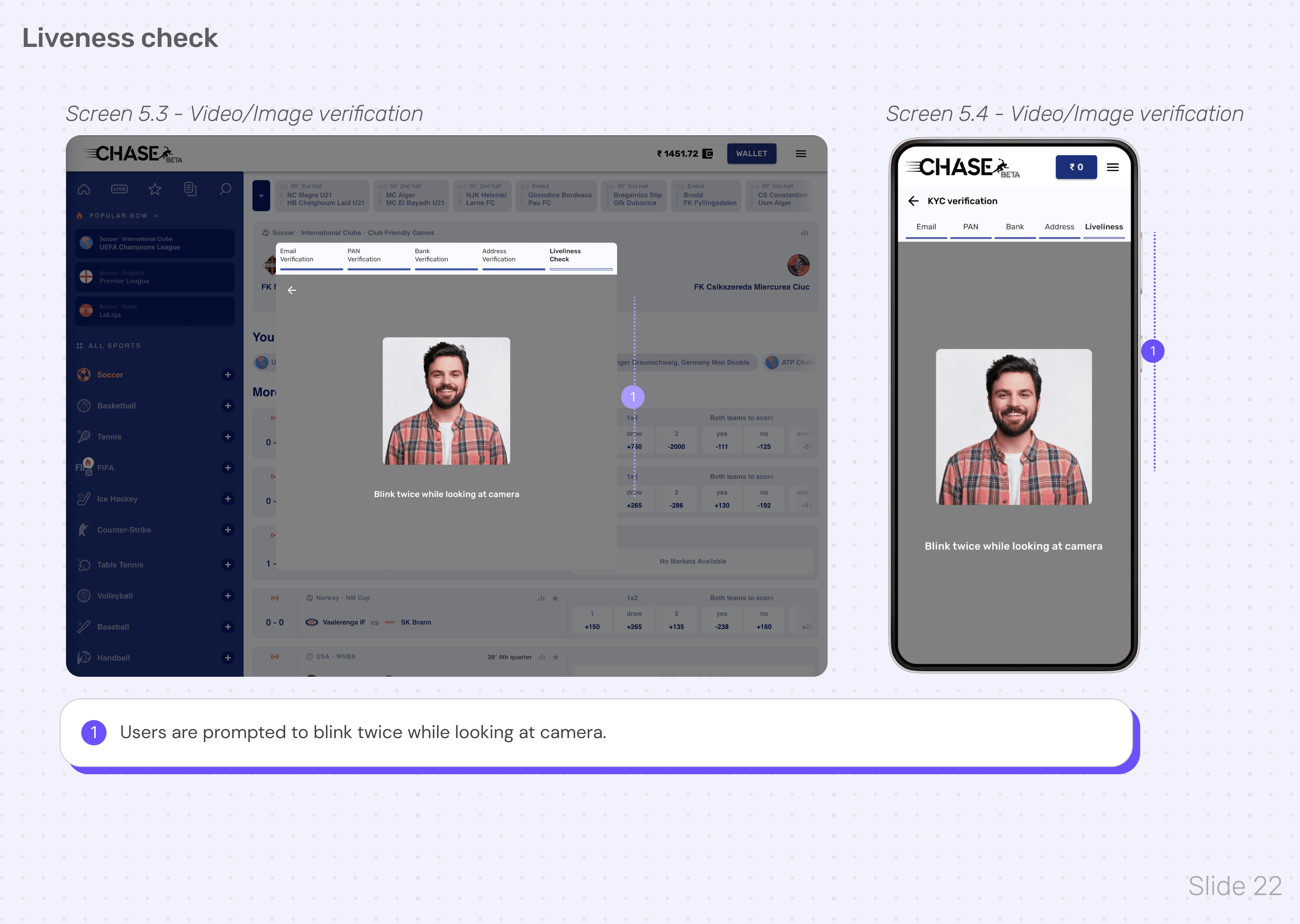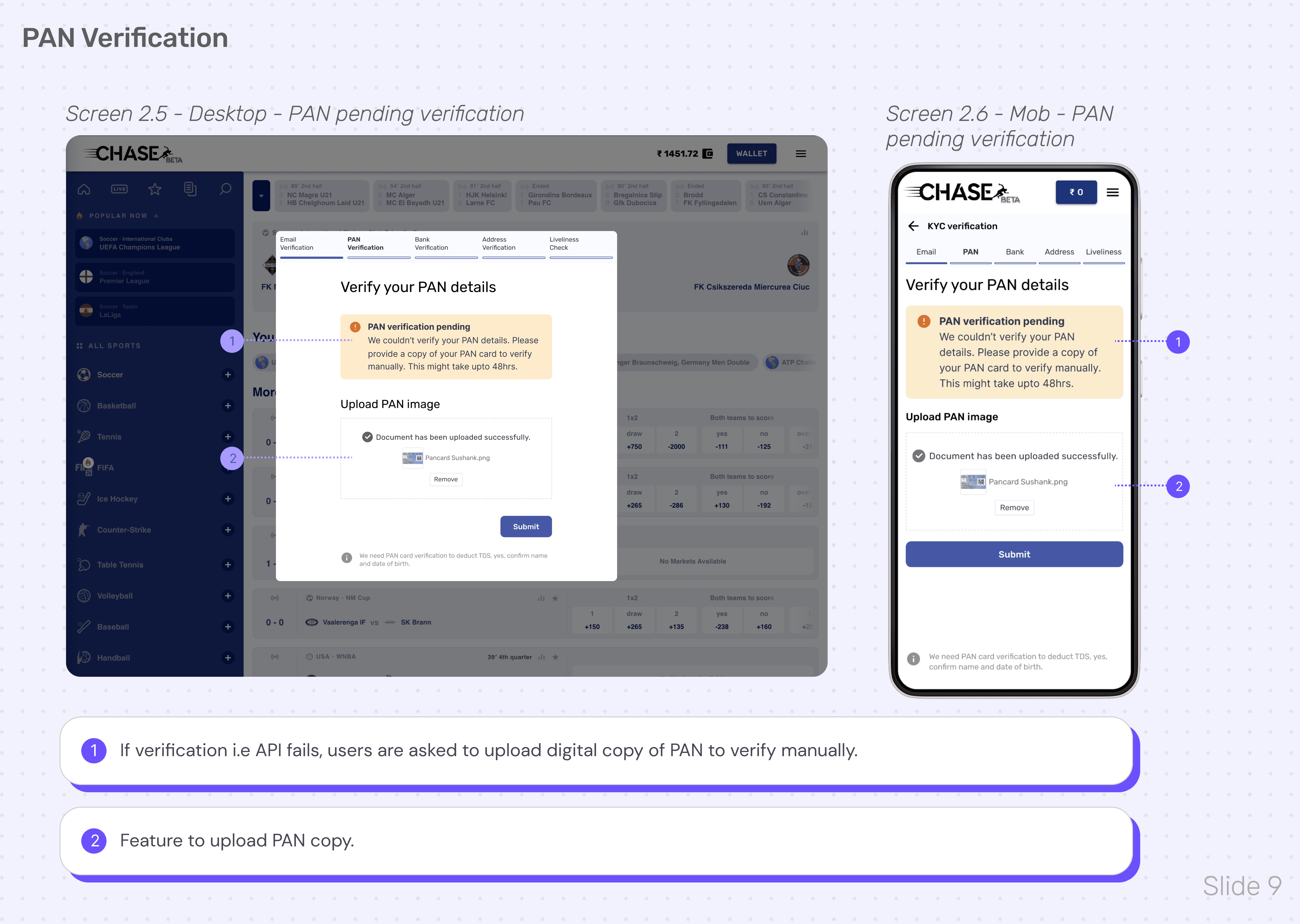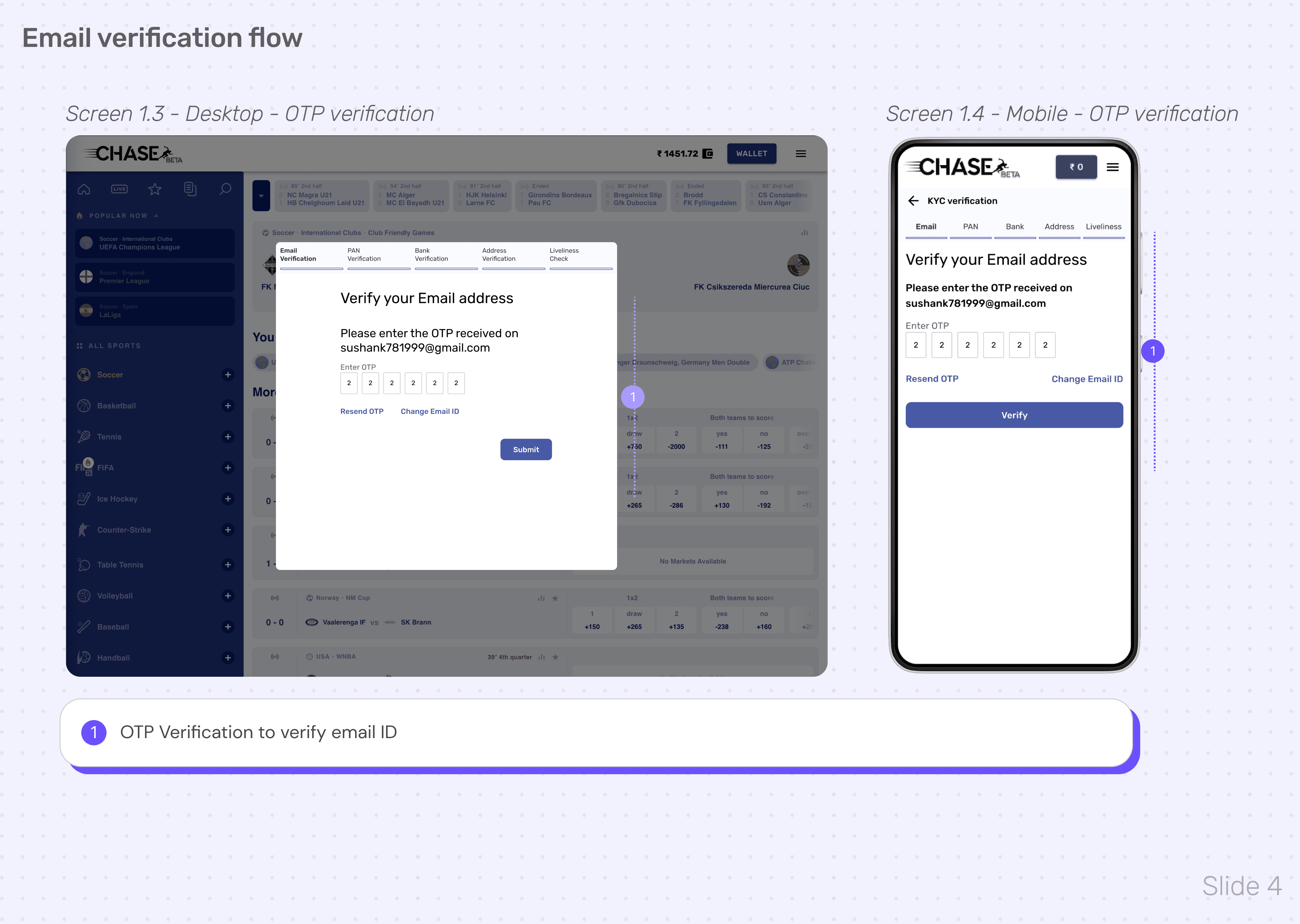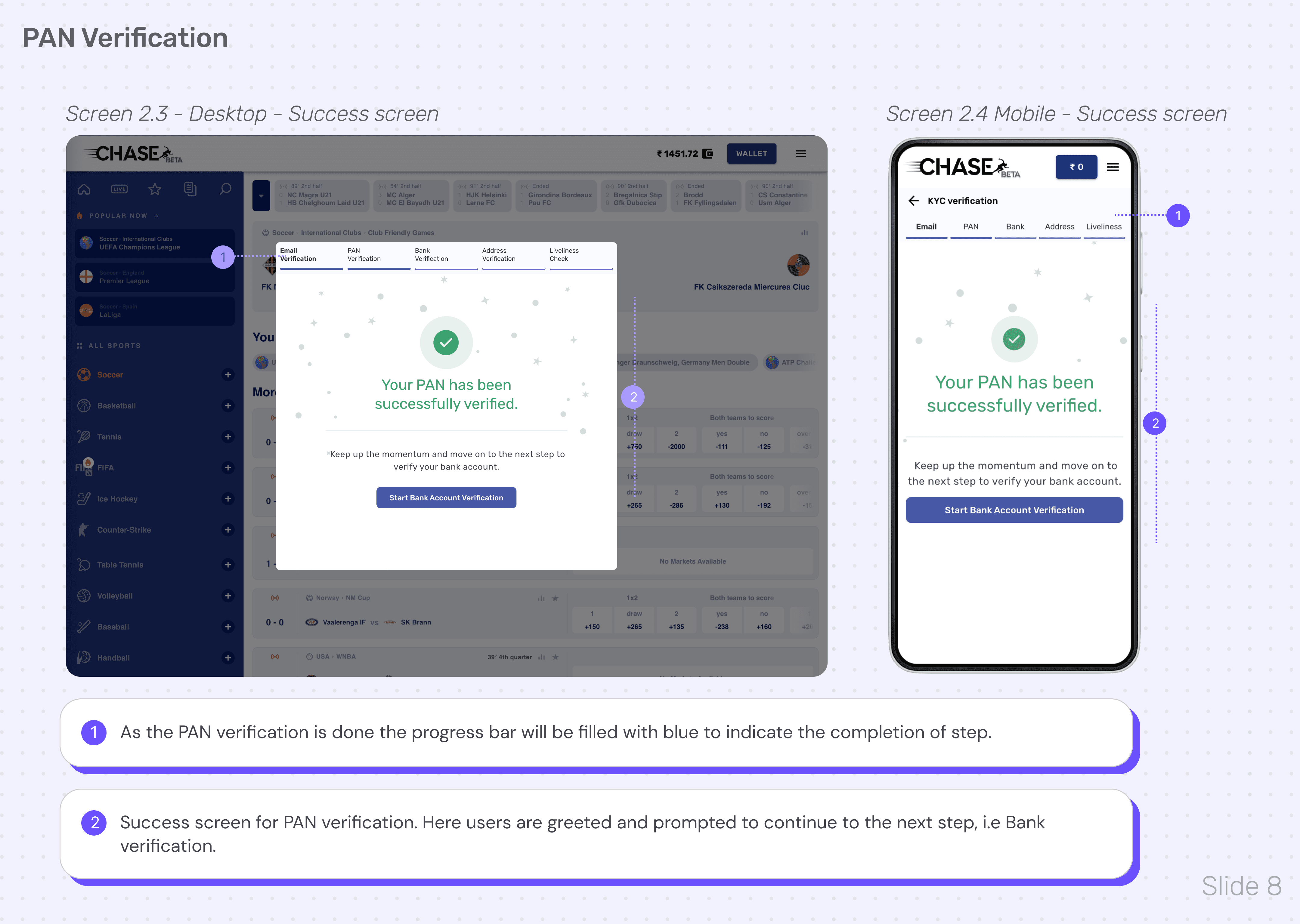 Embarking on a journey toward comprehensive user verification in the realm of digital betting and deposits, I had the privilege of designing the complete KYC flow. Comprising five critical steps – email verification, PAN verification, bank account verification, address proof verification, and a liveliness check – this project ensures users can seamlessly begin depositing, placing bets, and withdrawing their winnings. The goal was to create a user-friendly and efficient KYC process that safeguards the platform's integrity and user security, making it an essential cornerstone of the user experience.